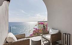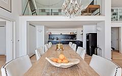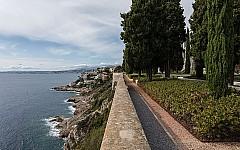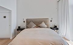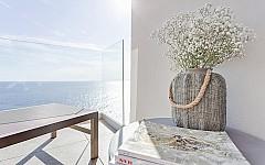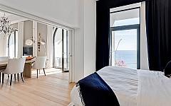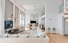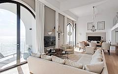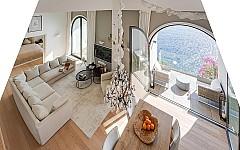 The apartment includes 2 spacious bedrooms featured with 2 en-suite bathrooms, a fully-equipped open space kitchen, delightful sea-view dining and living area continuing to elegant arch shape terraces, one of which is furnished with 2 classy comfortable armchairs and table, another one with sun bed so you can enjoy your day with spectacular views of the French Riviera coast. On the second floor there is a dressing room, a work studio with library and a laundry. The interior was created by Ralph Laurent interior designers. The apartment also includes a double garage, two parking spaces and a cellar.